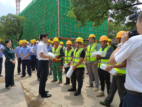 8月21日上午十一点,接近中午烈日炎炎,湘江集团党委书记、董事长张利刚一行来到华体会(中国)承建的长沙科技创意园项目,现场看望慰问高温天气下依然坚守战斗在岗位上的广大建设者,为大家送来了冰箱、电风扇、凉茶、藿香正气水、夏桑菊、西瓜等防暑降温用品。